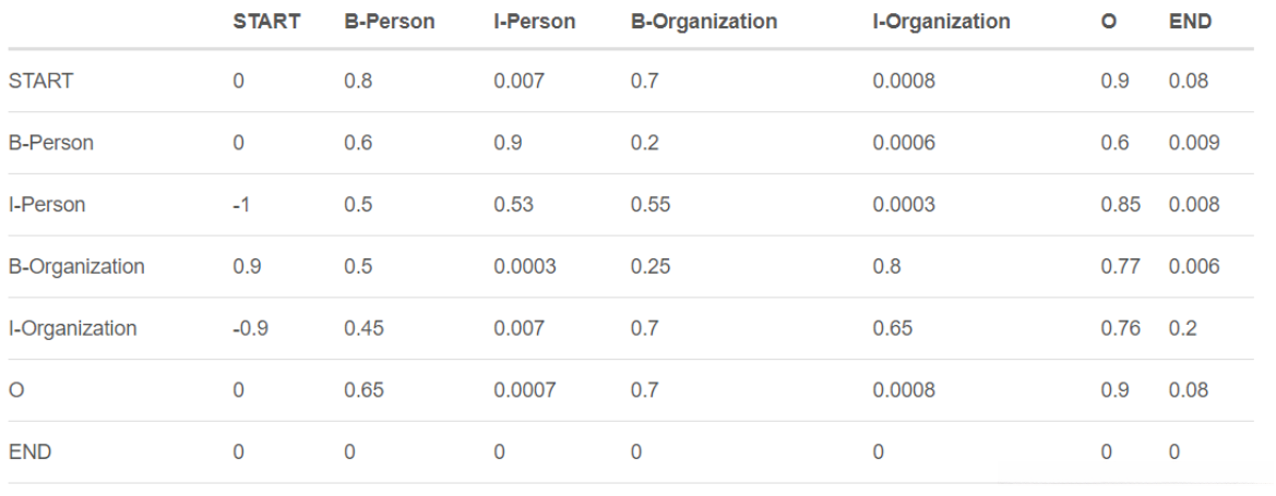 - 句子中第一个单词的标签应该以“B-”或“O”开头,而不是“I-”开头**(从“START”到“I- person 或 I- organization”的 transition 分数非常低)**