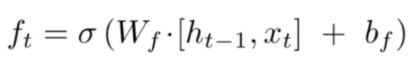 LSTM的第一步是决定我们要从细胞状态中丢弃什么信息,该决定由遗忘门实现,它查看ht-1(前一个输出)和xt(当前输入),并为单元格状态Ct-1(上一个状态)中的每个数字输出0和1之间的数字。1代表完全保留,而0代表彻底删除。