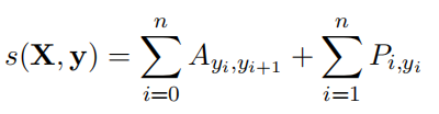 损失函数由两部分组成,P是LSTM得到的标签预测得分,是一个n*k维的矩阵,其中n指字符个数,k指标签个数,A是CRF得到的标签转移得分: