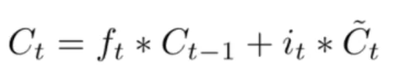 下一步是决定我们要在细胞状态中存储什么信息。 这部分分为两步。 首先,称为“输入门层”的Sigmoid层决定了我们将更新哪些值。 接下来一个tanh层创建候选向量Ct,该向量将会被加到细胞的状态中。