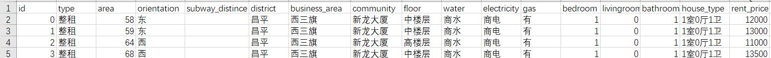 通过八爪鱼获取链家北京市13个区的租房数据共计21492条,并将其存储于Excel表格中并呈现如下形式