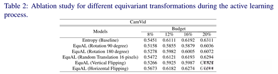 为了研究不同等变变换的效果,在表2中,研究了在使用CamVid时,在主动学习过程中采用五种不同等变变换的效果。平动和水平翻转是提高性能的唯一两种方式,这并不奇怪。作者认为,这种行为是因为诸如旋转或垂直翻转之类的变换会创建具有数据集中不存在的条件的图像。