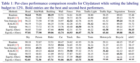 为了测量标记数据的多样性,对于Cityscapes中12%的预算,进一步计算最终标记集中数据的类别分布熵;与entropy基线(2.335)相比,本文的模型实现了更高的熵(2.376),这意味着所选样本更具多样性。