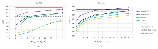 在实验中,对于所采用的的方法,使用相同的语义分割(网络都是Resnet50+FCN)。为了分析每种主动学习方法的真实潜力,对于所有实验,在主动样本选择过程,使用随机权重初始化分割网络。主动学习过程结束后,再使用主干网络Resnet50对数据集DL进行再训练,这里的主干网络使用在ILSVRC 1000类分类任务中预先训练的模型的权重进行初始化。
