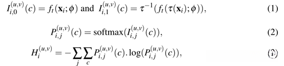 在每次迭代中,主动学习的目标就是选择要标记的未标记图像块,并将其添加到训练数据集DL。为了识别要标记的未标记图像块,本文使用不确定性采样。不确定性采样根据我们当前的模型选择具有高度不确定性的图像区域。具有高度不确定性的区域对应于语义分割网络难以分类的图像区域。Xi表示Du中的第i张图片,在第t次迭代中,有两个输出,分别响应原始图像和图像的转换版本(即翻转图像):