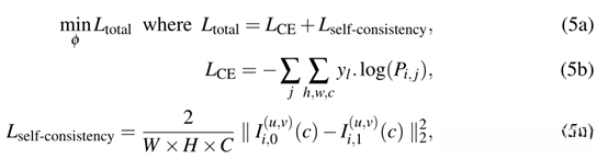 对于标记数据集中的每张图片xi,都有其真实值yi。在现有的用于语义分割的主动学习方法中,网络都是通过已标记数据来最小化交叉熵达到更新。然而那些图像中未标记的区域也同样有丰富的信息可以减少网络的不确定性。所以这里提出了同时利用标记和未标记区域来提高网络的自一致性。