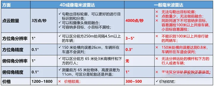 4D成像毫米波雷达和一般毫米波雷达的对比,汇总如下表所示: