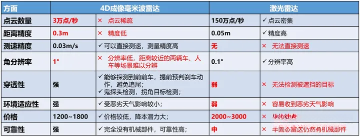 4D成像毫米波雷达和激光雷达的对比,汇总如下表所示: