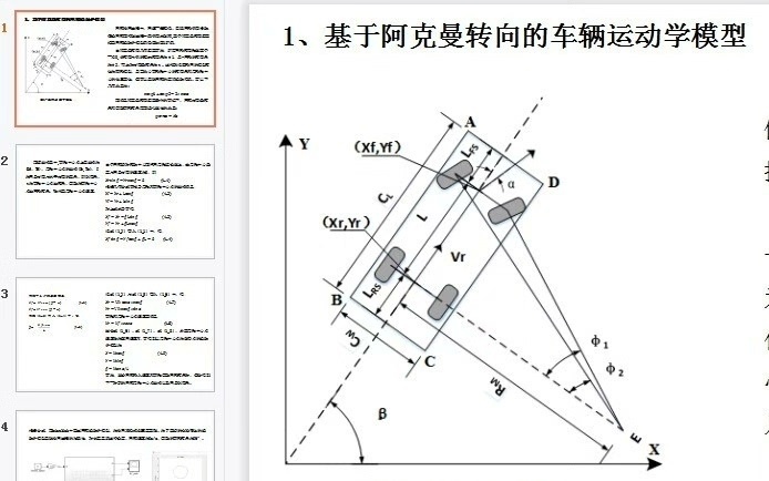 在确定车辆几何参数后,接下来需要建立车辆模型的运动学方程。运动学方程描述了车辆的位置、速度和加速度之间的关系。在阿克曼转向中,车辆的前轮转角和后轮转角是重要的参数,它们与车辆的航向角、车速、转弯半径等之间存在一定的关系。