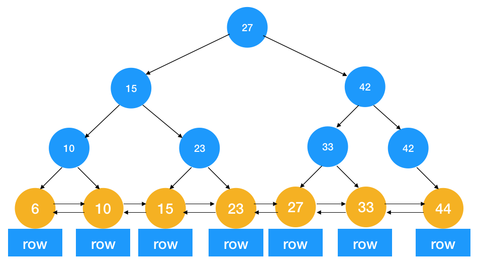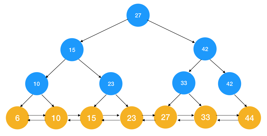 可以看到主要区别就是所有的节点值都在最后叶节点上用双向链表连接在了一起,仔细和跳表对比一下 ,是不是很像,现在如果我们要找15 ~ 27 这个区间的数只要先找到 15 这个节点(时间复杂度 logn = 3 次)再从前往后遍历直到 27 这个节点即可,即可找到这区间的节点,这样它完美地支持了我们提的三个需求:快速查找值,区间,顺序逆序查找。