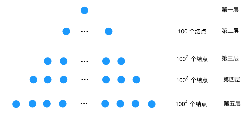 可以看到,最多遍历五次(实际上根节点一般存在内存里的,所以可以认为是 4 次)!磁盘 IO 一下从 27 减少到了 5!性能可以说是大大提升了,有人说 5 次还是太多,是不是可以把 100 叉树改成 1000 或 10000 叉树呢,这样 IO 次数不就就能进一步减少了。