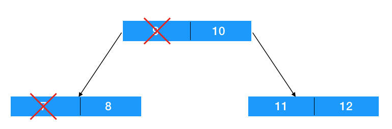 当我们删除 id 为 7,9 对应行的时候,上图中的索引就要更新,把 7,9 删掉,此时 8,10 就应该合到一个节点,不然 8,10 分散在两个节点上,可能造成两次 IO 读,势必会影响查找效率! 那什么时候会发生页合并呢,我们可以定个阈值,比如对于 N 叉树来说,当节点的个数小于 N/2 的时候就应该和附近的节点合并,不过需要注意的是合并后节点里的元素大小可能会超过 N,造成页分裂,需要再对父节点等进行调整以让它满足 N 叉树的条件。