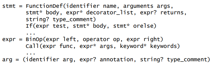 ASDL语法和上下文无关语法比较相似,多了两种重要信息:type和field.ASDL语法中有两种类型:复合类型(composite type)和原生类型(primitive type)。每种复合类型定义一组构造器,如