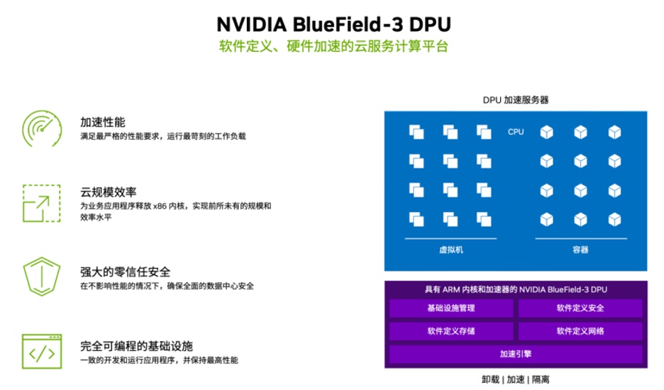NVIDIA创始人兼首席执行官黄仁勋指出,在人工智能时代实现快速发展的前提是具备强大的计算基础。**"蓝光三DPU"技术使这一愿景得以实现,在此过程中将传统的云计算架构创新性地转变为集加速、节能与安全于一体的专用基础设施,在特别适用于对AI生成工作负载要求极高的场景下发挥出色表现。