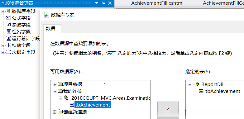 在区域中新增一个数据集,并在此处创建DataTable(数据表),增添所需的数据字段。同时,请注意确保各字段的数据类型与数据库中的对应设置一致。