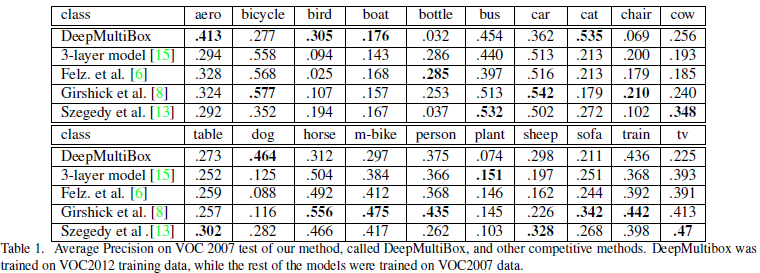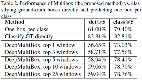 就检测率而言,DeepMultiBox 要略微差于ILSVRC 2012 上的Localization 任务的冠军One-box-per-class。但和One-box-per-class 比较,DeepMultiBox 有几点优势: