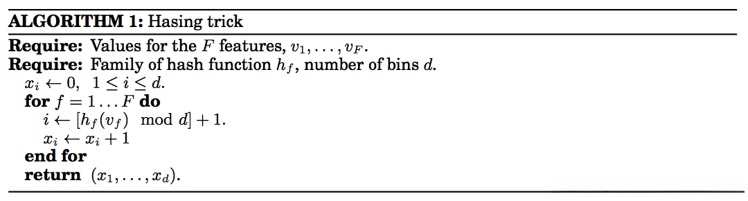 通过Hash函数将特征映射至一个固定长度的哈希表之后,并对其进行one-hot编码处理,则可使得特征维度得以固定下来。在此过程中可能会出现碰撞现象,在某些情况下这种碰撞反而是降维的一种表现形式,并且能够进一步提升性能