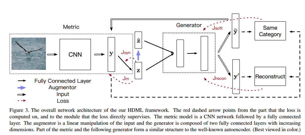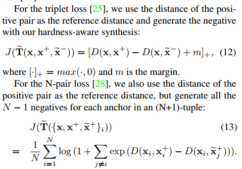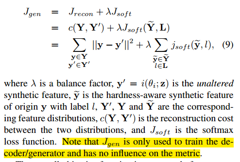 Jm目的是在嵌入空间中学习使得类间距离更大,类内距离更小。Jsyn利用合成的困难样本是的度量学习更加高效。 对于JT可以选择 triplet loss 或者 N-pair loss