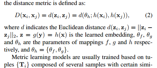 深度度量学习方法旨在学习有效度量,以准确地衡量数据点之间的相似性。 他们利用深度神经网络构建从数据空间到嵌入空间的映射,使嵌入空间中的欧几里德距离能够反映数据点之间的实际语义距离,即类间样本之间的距离相对较大,而类内样本之间的距离相对较小。 最近已经提出了各种深度量度学习方法,并且已经证明在各种任务中具有很强的有效性,例如图像检索,人员重新识别和地理位置定位。