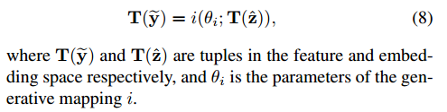 然后使用编码器去实现 g ,i 的映射。g 是将 feature space中的 y 映射到 embedding space 中的 z,而在embedding space 中首先将 z 利用难度增强修订为 z^ , 生成器 i 的作用是 将 z 和 z^ 重新映射到 feature space 中为 y’ ,y~ 。同时y~应该保留原来样本的标签以及难度 ,所以我们需要制定的生成器目标为如下公式: