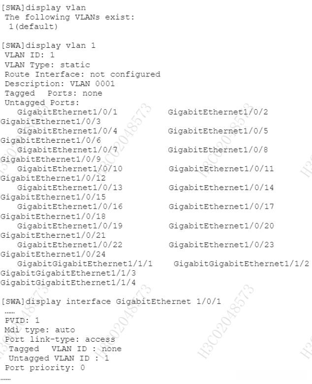 从上述信息可以看出,该端口的 P VID 设置为 1,并且其类型被配置为 trunk 端口。该设置允许所有 VLAN 经由该端口转发数据流量(然而实际上仅有 VLAN 1 和 VLAN 2 可在此端口中正常转发数据流量(因为交换机仅配置了 VLAN 1 和 VLAN 2)。在 SWB 上的 VLAN 参数以及 G1/0/24 端口相关信息与上述情况类似。
