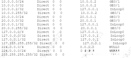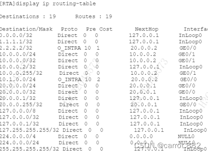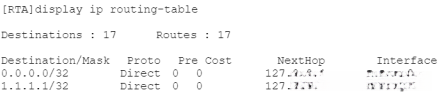 在RTA上使用display ip routing-table查看路由器全局路由表