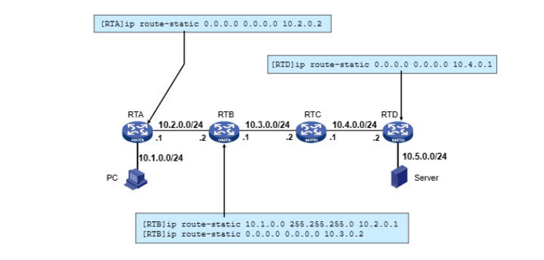 图中,在PC与Server之间的路由器上设置静态路由以实现通信连接