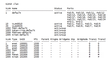 第3步: 在采用特权执行模式的交换机S1上,请输入show vlan命令以查看该交换机上的VLAN信息。