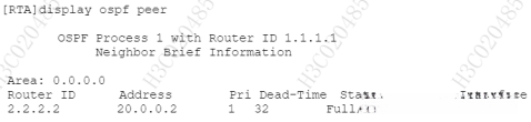 在RTA上使用display ospf peer查看路由器OSPF邻居状态
