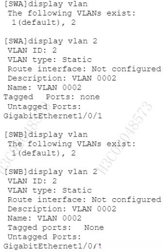 分别在交换机组端口地址(SWA)和(SWB)上建立VLAN 2网络,并将通过PCA和PCC设备连接的端口G1/0/1配置为属于该VLAN 2网络。