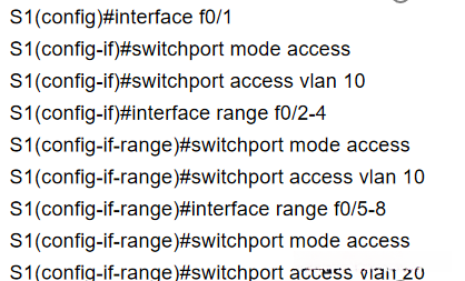 步骤2: 在交换机S1的全局配置模式下输入以下代码,为VLAN分配端口。
