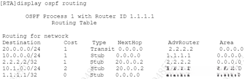 在RTA上使用display ospf routing查看路由器的OSPF路由表