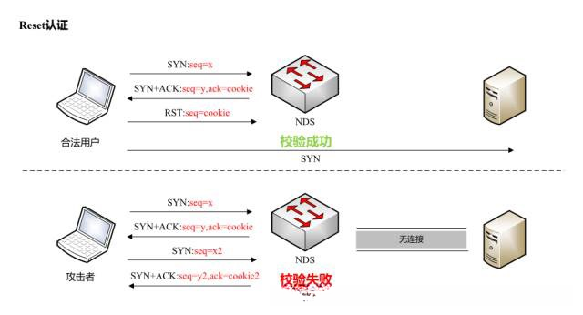 Reset认证利用的是TCP协议的可靠性,也是首先由DDOS防护系统来响应syn。防护设备收到syn后响应syn_ack,将Acknowledgement number (确认号)设为特定值(记为cookie)。当真实客户端收到这个报文时,发现确认号不正确,将发送reset报文,并且sequence number 为cookie + 1。 而伪造的源,将不会有任何回应。这样我们就可以将真实的客户端IP加入白名单。
