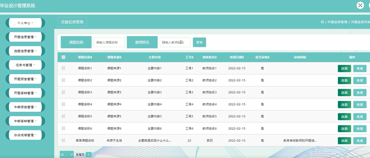 开展开题信息管理工作的过程中,在相关网页界面中可以通过查阅课题名称等基本信息以及工号、教师姓名、申请时间点、是否经过审核阶段等关键数据来实现选题与查看等功能模块的开发设计。如图5-12所示。