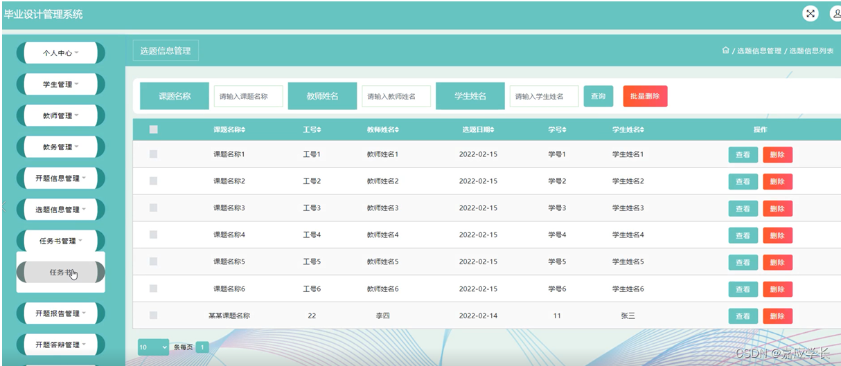 本系统提供了选题信息管理功能;在选题信息管理页面中可以浏览课题名称、工号、教师姓名、选题日期、学号以及学生姓名等相关信息,并支持执行删除操作;如图5-7所示。