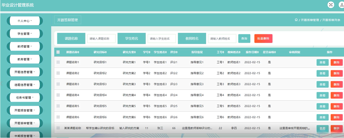 开题答辩管理模块内提供了丰富的信息查询功能,在线页面内可查看课题名称及编号(编号为XXX)、研究目标与方向(主要针对XXX领域)、研究方案与技术路线(其中涉及XXX关键技术)、学生学号及姓名(对应学号为XXXXX)、指导分数及等级(其中XX同学得分最高)、指导建议与意见(主要针对XXX同学的研究成果)、工作编号及负责人(工作编号为...)以及记录的时间节点(具体操作时间为...)。系统还支持查看和删除各项记录功能;如图5-9所示