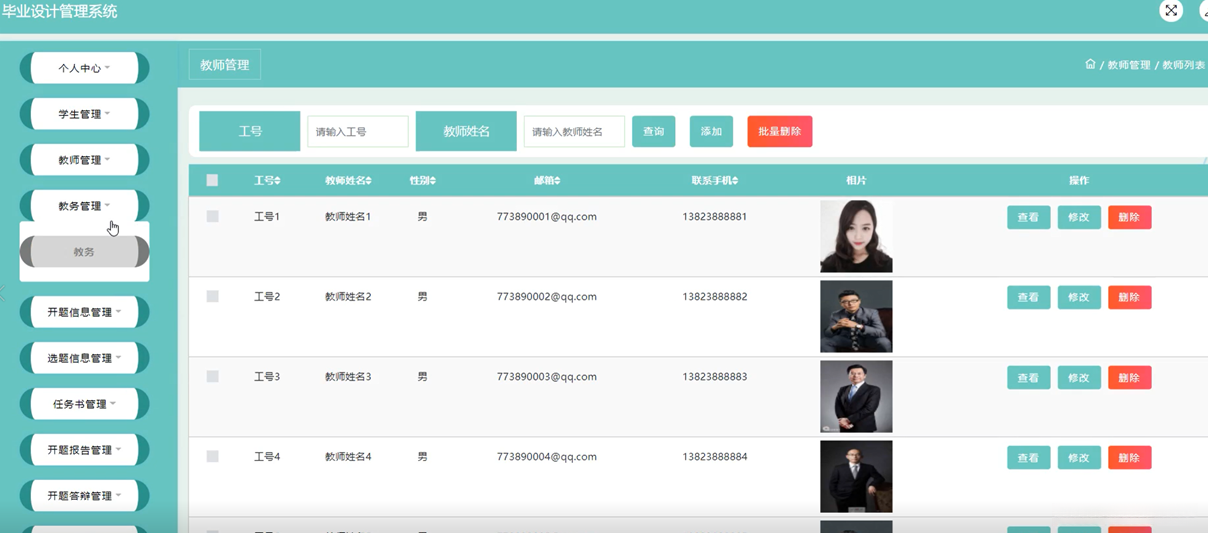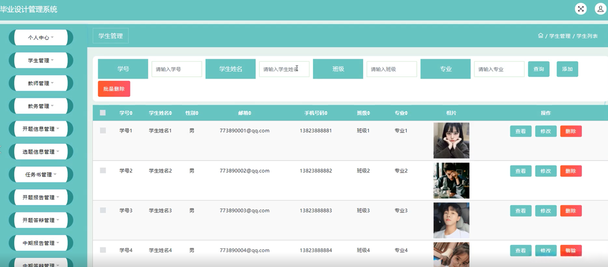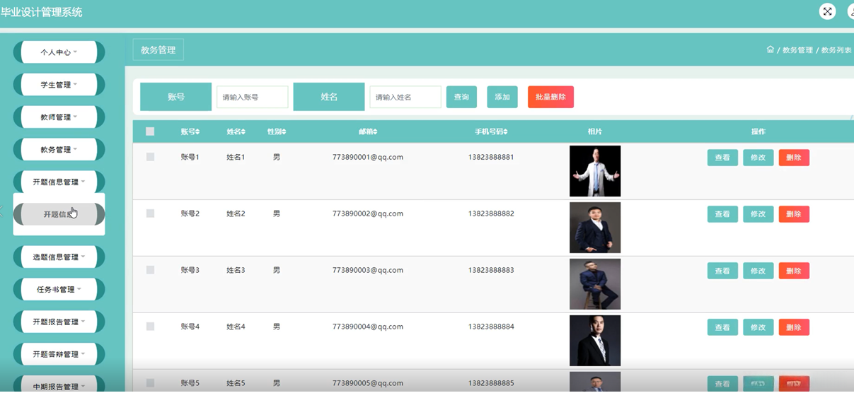 管理员使用账号进入毕业设计管理系统后,在个人中心等模块中浏览学生信息以及教师信息,并可完成相应的操作(包括开题报告撰写与提交等环节)。具体功能包括开题信息查询与提交、选题信息筛选与保存等,并可参考图5-2中的界面。