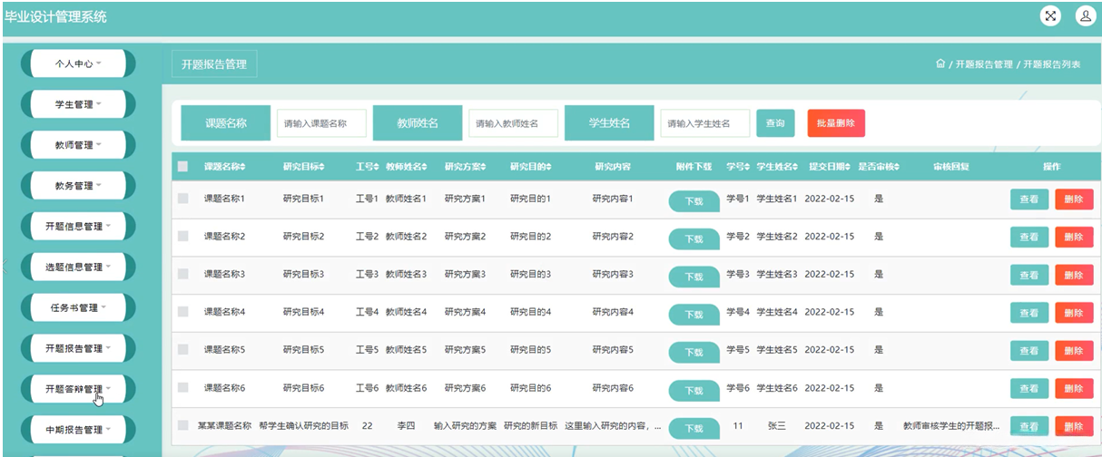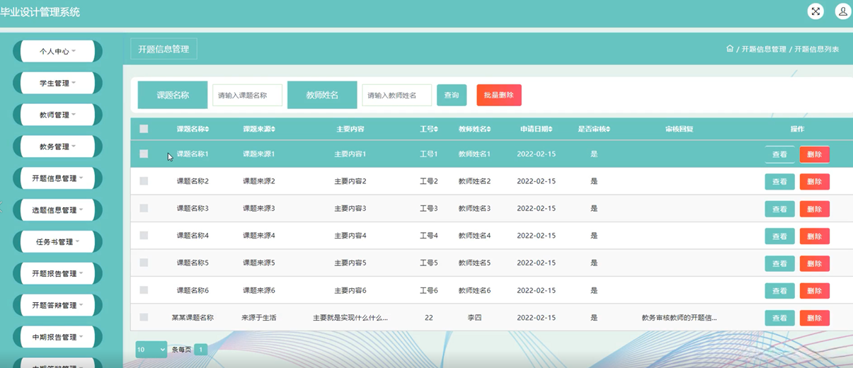 开题信息管理;在开题信息管理页面内能够浏览课题名称、课题来源以及项目内容等详细信息,并支持相关操作如查询与删除。如图5-6所示。
