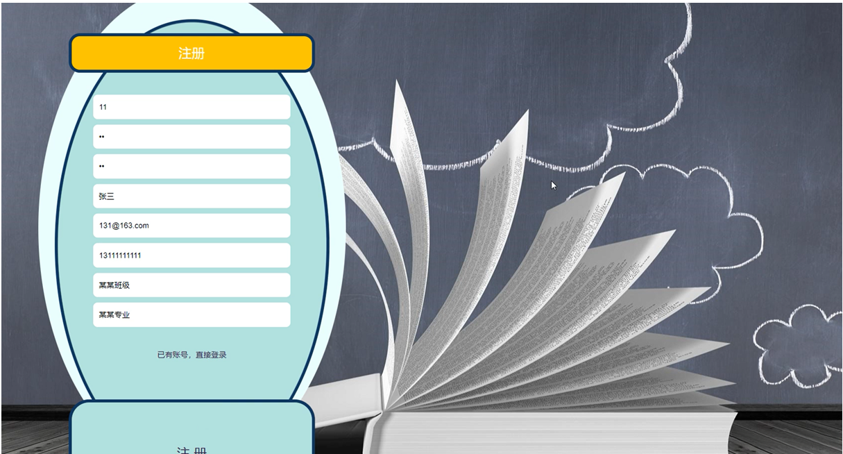 在注册页面进行操作时,用户需提供学号、密码、确认密码、姓名、邮箱地址以及手机号码等详细信息以完成注册流程。在登录页面进行操作时,请用户输入账号及对应的安全密码以便完成登录。如图5-10所示。
