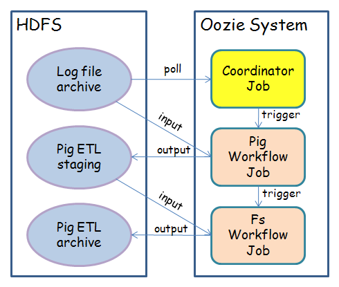 b) The Pig workflow task initiates upon completion of the Coordinator task and processes data from the log file archive directory before generating ETL outputs stored in a temporary staging area.
