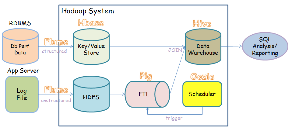 Hive is known as a schema-on-read SQL-supportive system on Hadoop. Schema-on-read means we only need to specify a schema when reading the data. Thus, the data to be queried on can be stored in any format. In this project, while appperfdata is stored in a structured format, db2perfdata is stored in Hbase specific format.