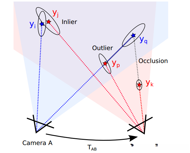 EMM模型,考虑在该变换下,其中一帧的点投射到另一帧,属于遮挡/可视/匹配关系。通过对每个点假设检验评估有效,统计有效比例来计算该transform是否有效。