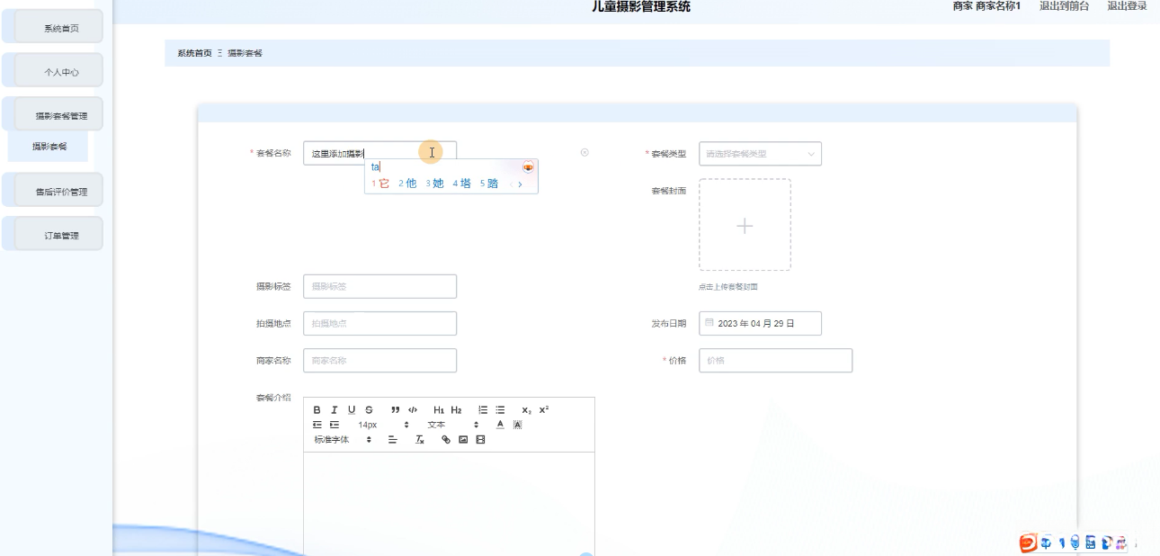 本研究将围绕儿童摄影管理系统的核心功能展开,具体包括以下几个方面:首先,构建用户管理模块,实现用户注册、登录、个人信息管理及权限分配等功能,确保系统使用的安全性与便捷性;其次,设计套餐类型与摄影套餐管理模块,允许商家灵活设置套餐内容、价格及优惠活动,满足不同顾客的多样化需求;再次,开发商家信息管理模块,包括商家资料展示、服务评价、在线咨询等功能,增强商家与顾客之间的互动与信任;同时,建立售后评价系统,鼓励顾客分享拍摄体验,为商家提供改进服务的依据;最后,构建摄影作品展示模块,支持高清图片上传、分类展示及在线分享,让顾客能够随时随地欣赏并分享孩子的美好瞬间。通过这些功能模块的设计与实现,全面提升儿童摄影服务的品质与效率。