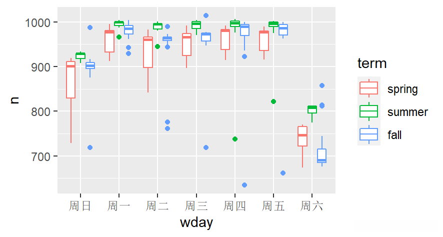 > daily%>%ggplot(aes(wday,n,color=term))+geom_boxplot()