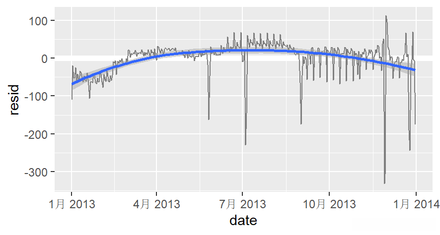 > daily%>%ggplot(aes(date,resid))+geom_ref_line(h=0)+geom_line(color="grey50")+geom_smooth()