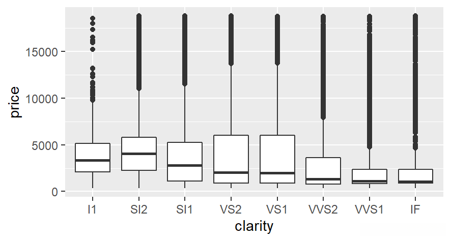 > ggplot(diamonds,aes(clarity,price))+geom_boxplot()
