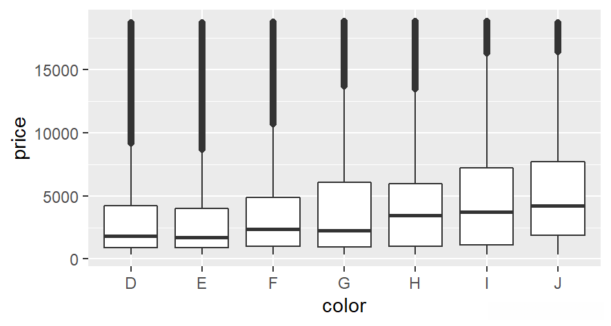 > ggplot(diamonds,aes(color,price))+geom_boxplot()