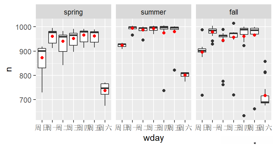 > ggplot(daily,aes(wday,n))+geom_boxplot()+geom_point(data=grid,color='red')+facet_wrap(~term)