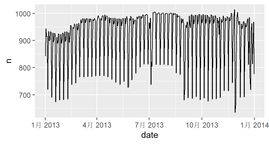> daily<-flights%>%mutate(date=make_date(year,month,day))%>%group_by(date)%>%summarize(n=n())