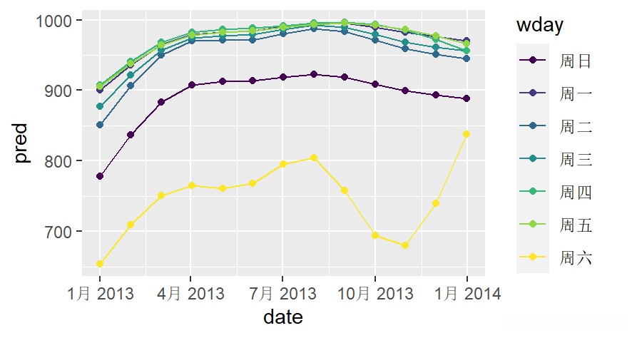 > daily%>%data_grid(wday,date=seq_range(date,n=13))%>%add_predictions(mod)%>%ggplot(aes(date,pred,color=wday))+geom_line()+geom_point()